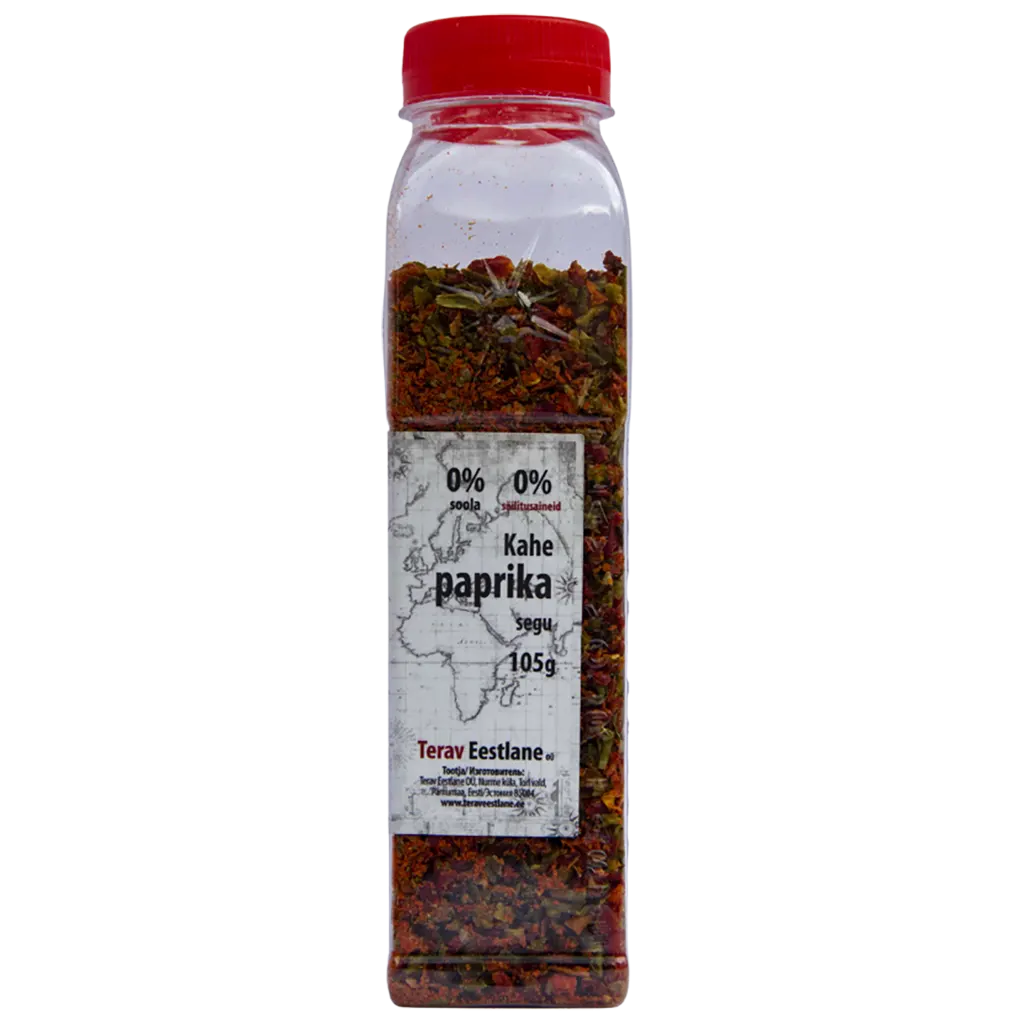 Kahden paprikan sekoitus vihreä ja punainen paprika, Terav Eestlane Kahden paprikan sekoitus on myös mausteseoksissa Supisegu on sekoitettu 50%-50% paprikat, sopii naudan-, linnun-, sian-, lampaanlihaan, keitot, munaruoat, juustot, salaatit, pataruoat. Paprika punainen synonyymit ovat: makeapippuri eli maustepaprika, espanjan paprika, unkarin paprika, indian paprika, turkinpippuri, eli eli tabascopippuri vihannespaprika, punainen paprika. Käyttö viljat siementen kanssa – kuivatettuna tai jauhettuna.