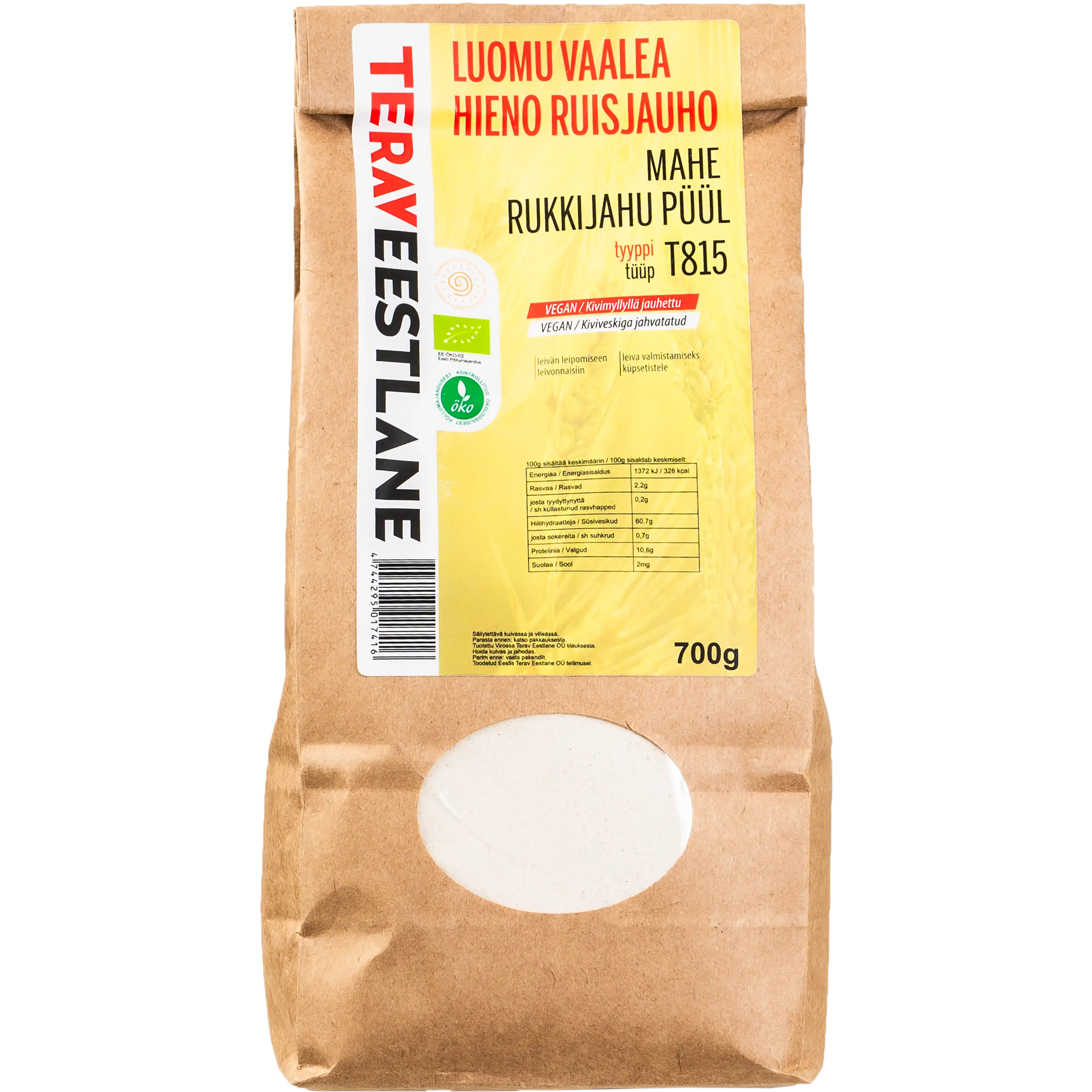 100g luomu ruisjauho T815 sisältää: energiaa 1420 kJ/ 335 kcal; rasvaa 1,42g, josta tyydyttynyttä 0,2g; hiilihydraatteja 66,7g, josta sokereita 5,7g, proteiinia 8,91g; suolaa 2 mg. Kivimyllyllä jauhettu leivän leipomiseen paneroimiseen.