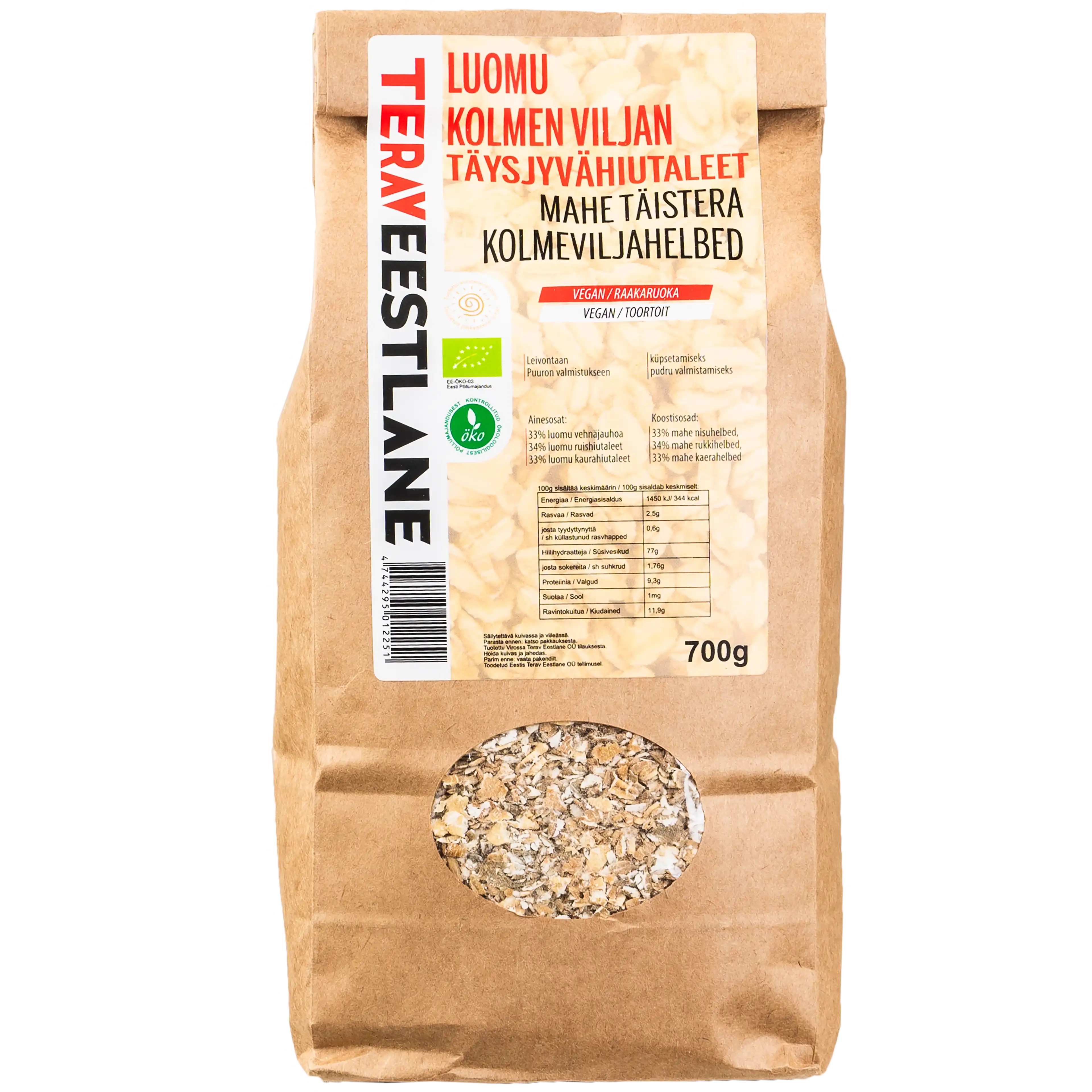 Raakaruoka leivontaan, puuron valmistukseen. Ainesosat: 33% luomu vehnäjauhoa, 34% luomu ruishiutaleet, 33% luomu kaurahiutaleet. Ainesosat: 33% luomu vehnäjauhoa, 34% luomu ruishiutaleet, 33% luomu kaurahiutaleet. 100g luomu kolmen viljan täysjyvähiutaleet sisältää: energiaa 1450 kJ/ 344kcal; rasvaa 2,5g, josta tyydyttynyttä 0,6g; hiilihydraatteja 77g, josta sokereita 1,76g; proteiinia 9,3g; suolaa 1mg, ravintokuitua 11,9g.