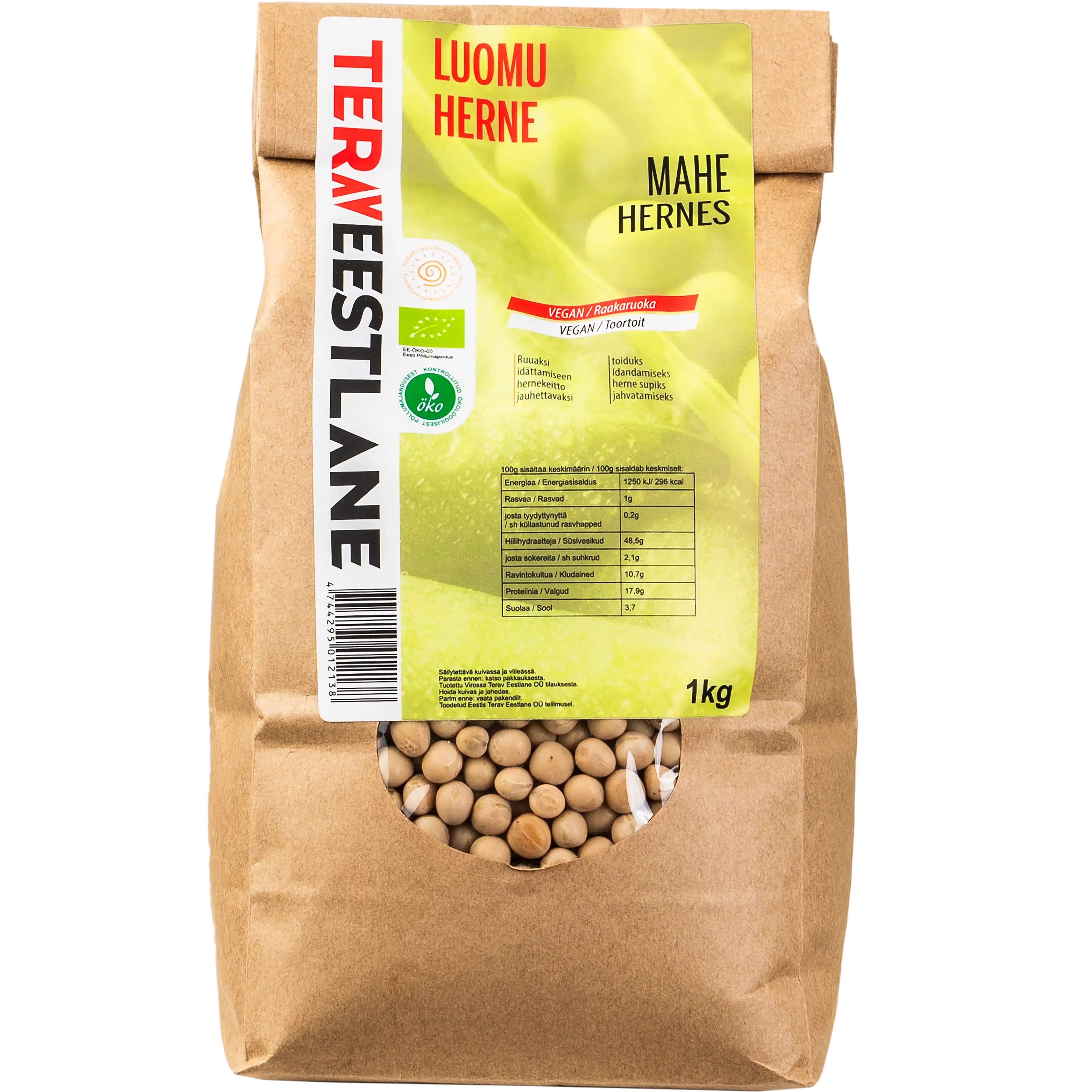 100g luomu herne sisältää: energiaa 1250 kJ/ 296 kcal; rasvaa 1g, josta tyydyttynyttä 0,2g; hiilihydraatteja 48,5g, josta sokereita 2,1g; proteiinia 17,9g; suolaa 3,7 mg, ravintokuitua 10,7g. Sopii ruuaksi, idättamiseen, hernekeitto, jauhettavaksi.