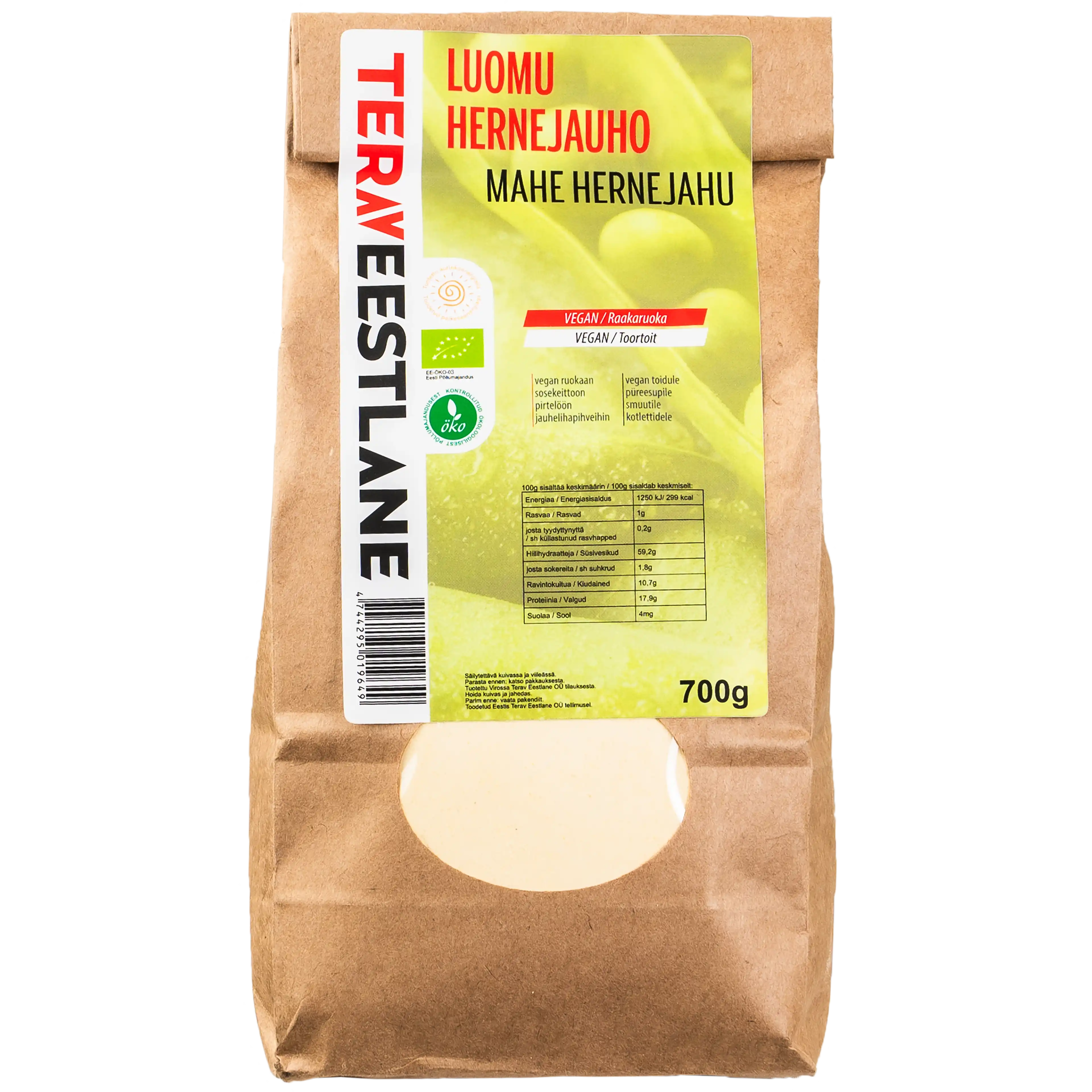 100g luomu hernejauhoa sisältää: energiaa 1250 kJ/ 299 kcal; rasvaa 1g, josta tyydyttynyttä 0,2 g; hiilihydraatteja 59,2g, josta sokereita 1,8g; ravintokuitua 10,7g, proteiinia 17,9; suolaa 4 mg. Sopii vegan ruokaan, sosekeittoon, pirtelöön, jauhelihapihveihin.