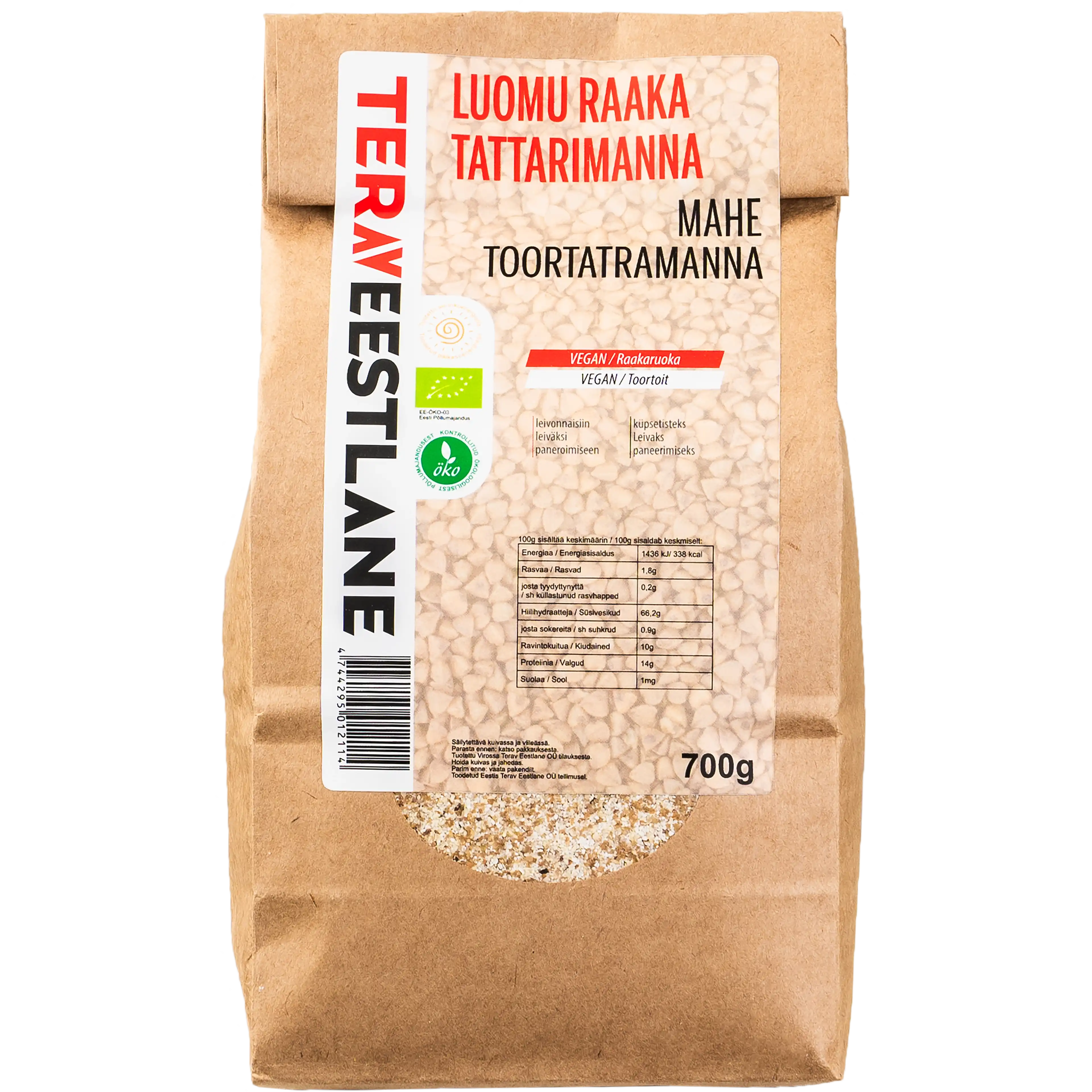 Sopii leivonnaisiin, leiväksi, paneroimiseen, puuro 100g eko raakatattarimanna sisältää keskimäärin: energiaa 1436 kJ/338 kcal, rasvaa 1,8g, josta tyydyttyneitä 0,2g, hiilihydraatteja 66,2g, josta sokereita 0,9g, proteiinia 14g, suolaa 1mg, ravintokuitua 10g.