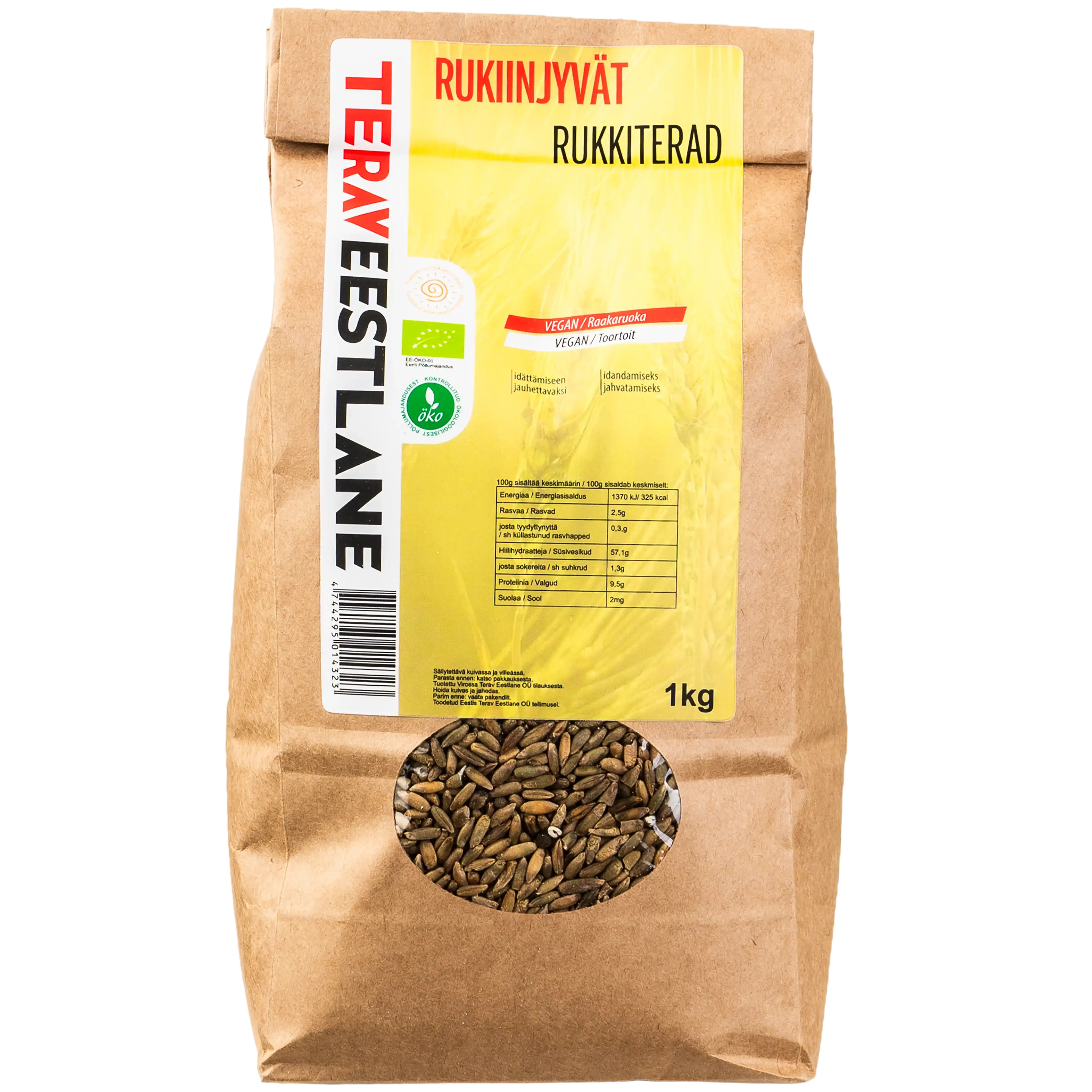 100g luomu rukiinjyvät sisältää: energiaa 1370 kJ/ 325 kcal; rasvaa 2,5g; josta tyydyttynyttä 0,3g; hiilihydraatteja 57,1g, josta sokereita 1,3g; proteiinia 9,5g; suolaa 2mg. Raakaruoka, idättämiseen, jauhettavaksi