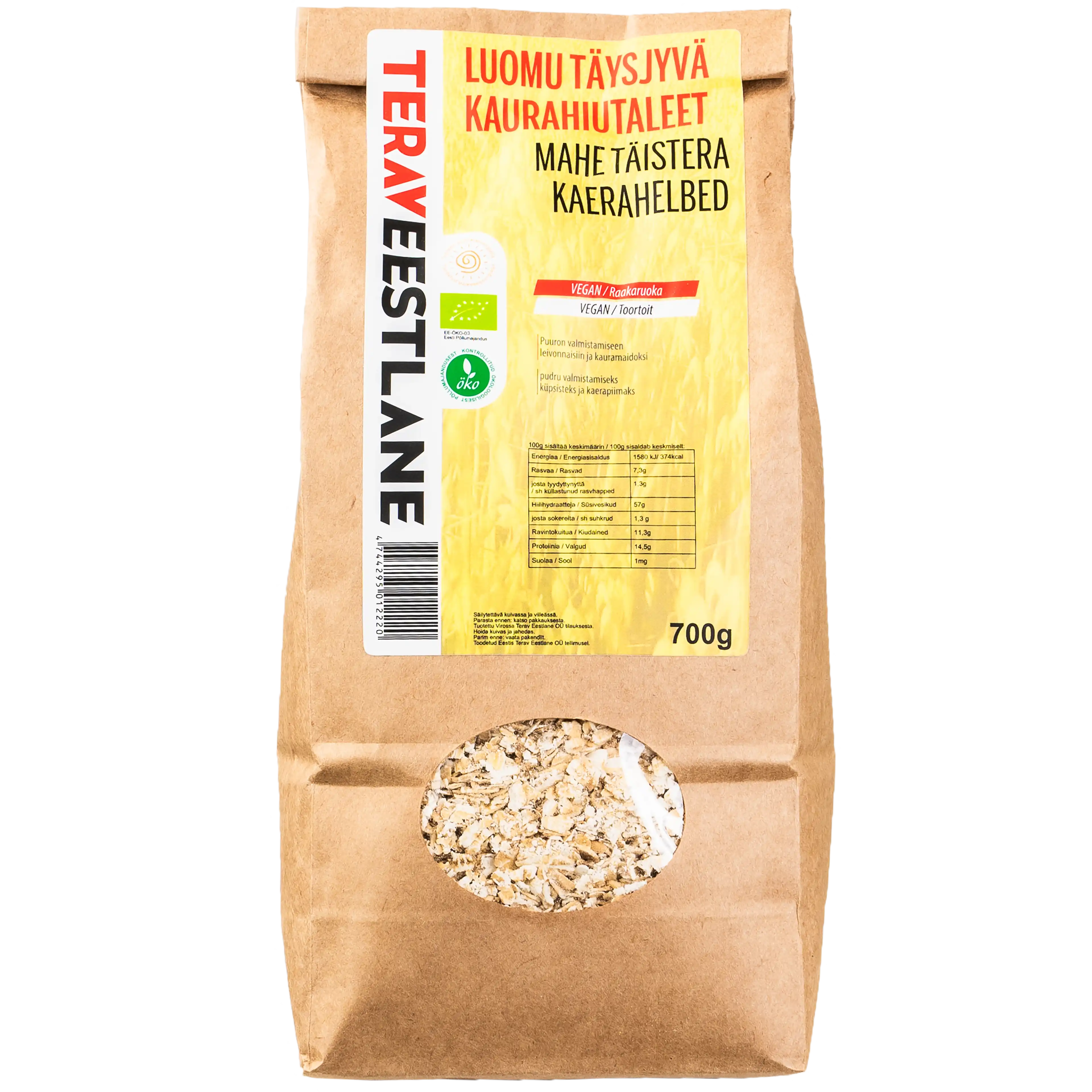 Täysjyvä kaurahiutaleet sopii raakaruoka puuron valmistamiseen, leivonnaisiin ja kauramaidoksi. 100g luomu kaurahiutaleita sisältää: energiaa 1580 kJ/ 374 kcal; rasvaa 7,3g, josta tyydyttynyttä 1,3g, hiilihydraatteja 57g, josta sokereita 1,3g; proteiinia 14,5g; suolaa 1 mg, ravintokuitua 11,3g.