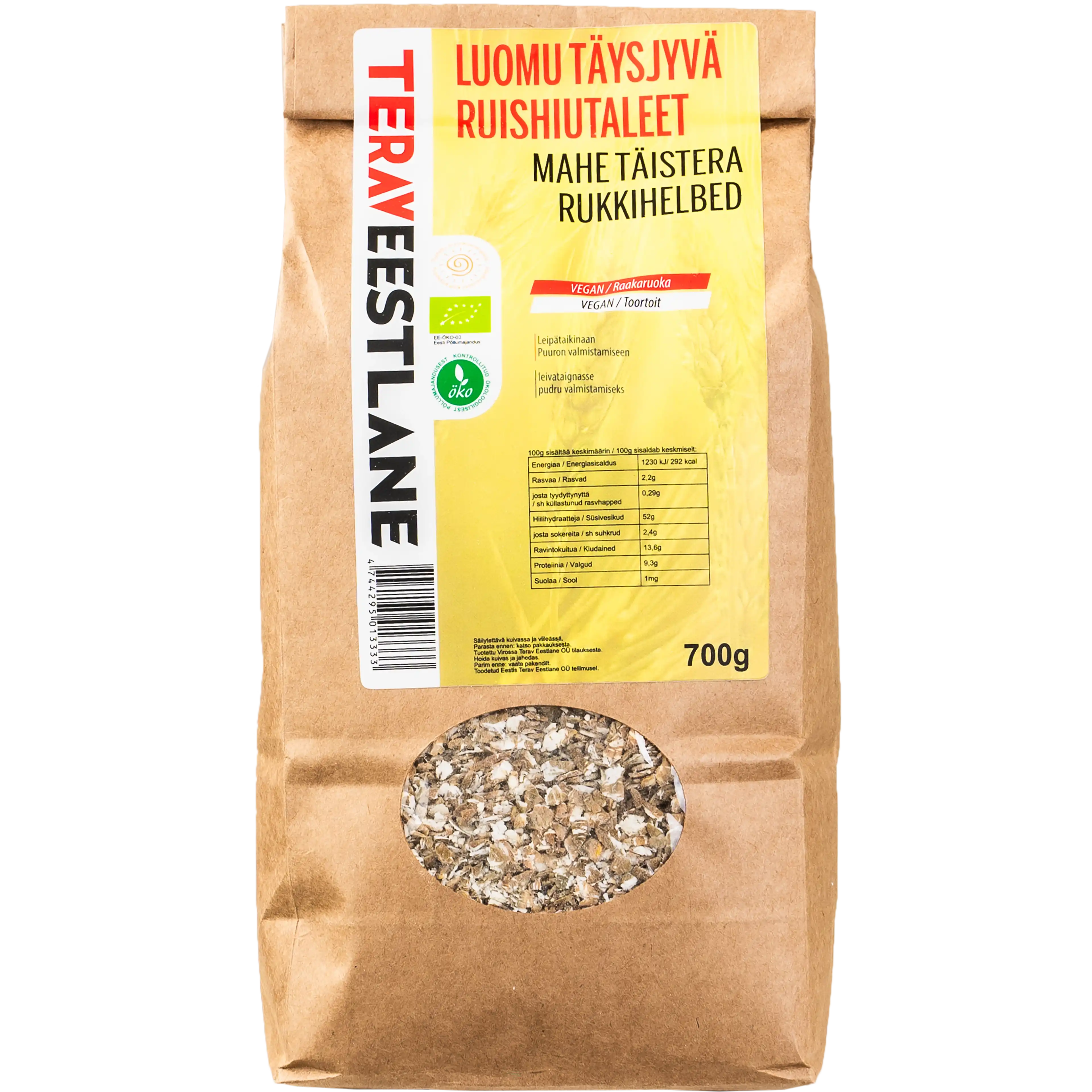 100g luomu ruishiutaleita sisältää: energiaa 1230 kJ/ 292 kcal; rasvaa 2,2 g, josta tyydyttynyttä 0,29g; hiilihydraatteja 52g, josta sokereita 2,4g; proteiinia 9,3g; suolaa 1 mg, ravintokuitua 13,6g. Sopii leipätaikinaan, puuron valmistamiseen.