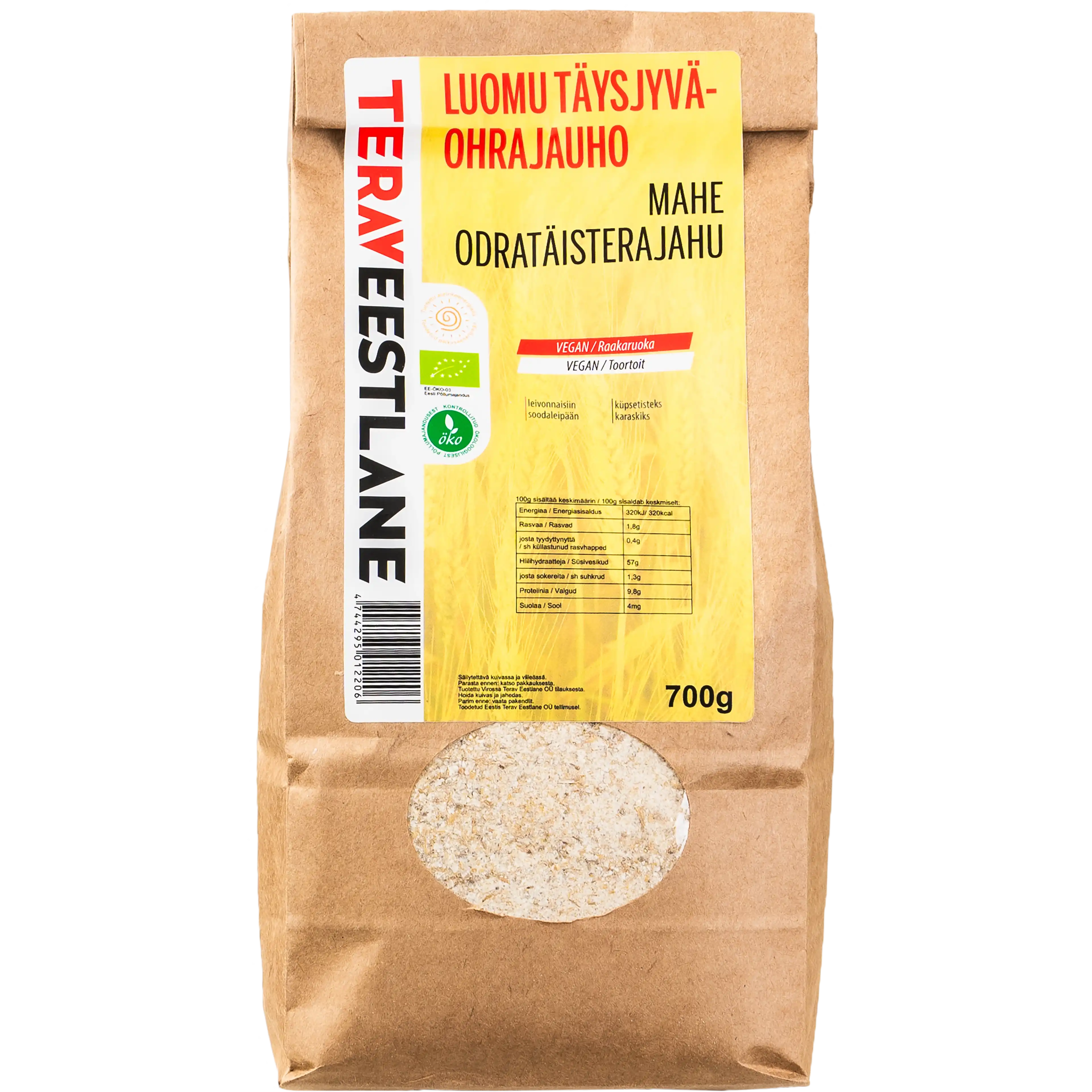 100g eko täysjyväohrajauho sisältää keskimäärin: energiaa 1320 kJ/ 320 kcal, rasvaa 1,8g, josta tyydyttynyttä 0,4g, hiilihydraatteja 57g, josta sokereita 1,3g, proteiini 9,8g, suolaa 4 mg. Sopii leivonnaisiin soodaleipään . Raakaruoaka.